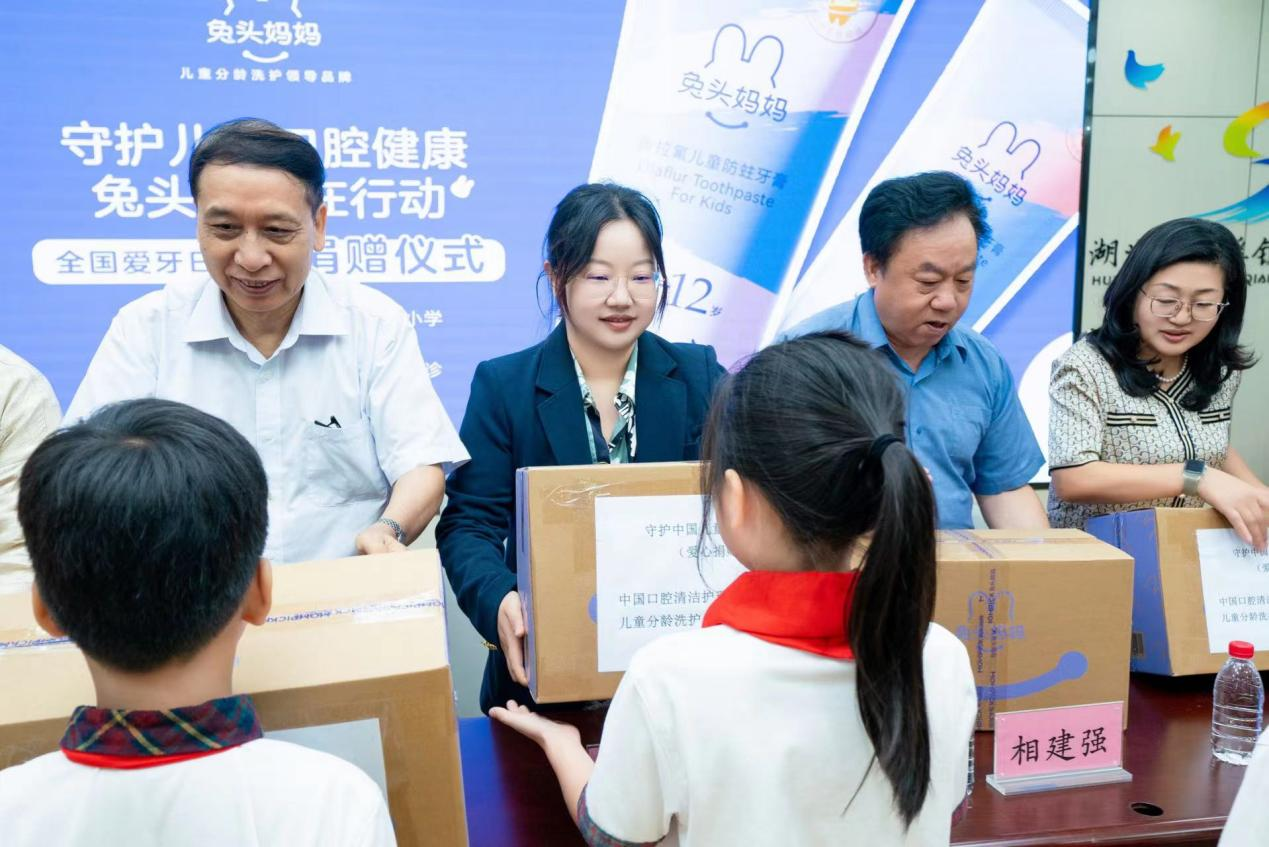 9月14日,全国爱牙日前夕,儿童分龄洗护领导品牌兔头妈妈携手中国口腔清洁护理用品工业协会共同开启了【守护中国儿童口腔健康公益行动】,双方共赴湖州市埭溪镇上强小学启动捐赠仪式。