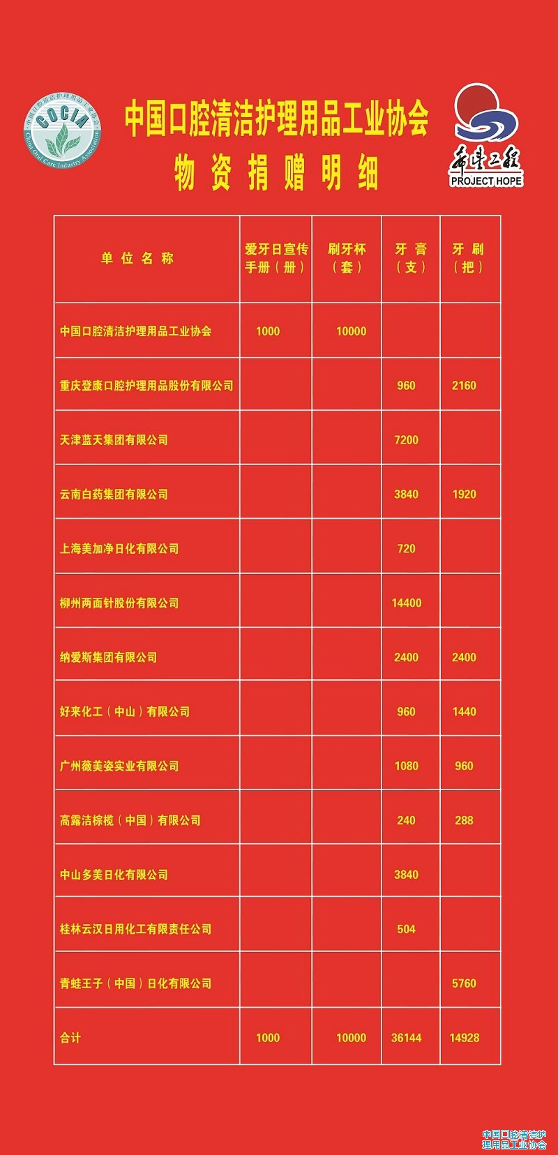 2016年全国爱牙日公益捐赠活动物资捐赠明细