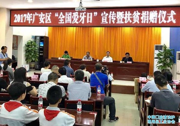 今年9月20日是第29个“全国爱牙日”,今年“爱牙日”的活动主题为“口腔健康 全身健康”。为进一步普及口腔卫生知识,强化公众对口腔卫生的关注,中国口腔清洁护理用品工业协会在部分会员企业的大力支持下,在我国著名革命老区——四川省广安市广安区举办了一次有声有色的公益捐赠活动。活动包括口腔健康教育、口腔疾病义诊、口腔护理产品和宣传册捐赠等。参加活动的有100多名中小学生和老师代表,以及区政府相关部门负责人。广安区区委常委、工会主席蒋西南到会讲话并为协会和各捐赠企业赠送了证书。活动取得圆满成功。