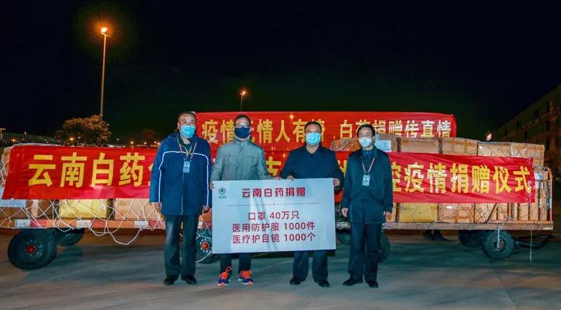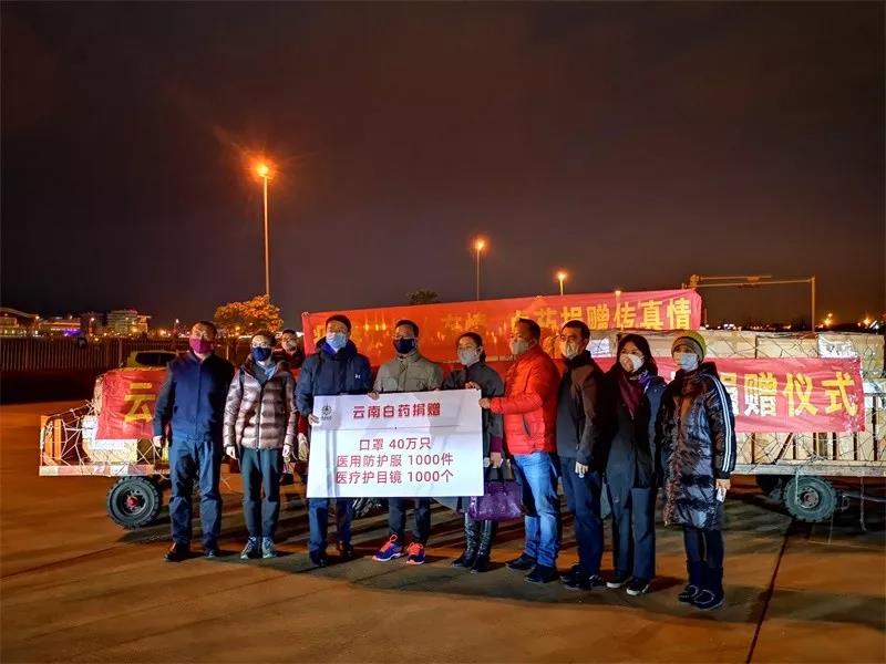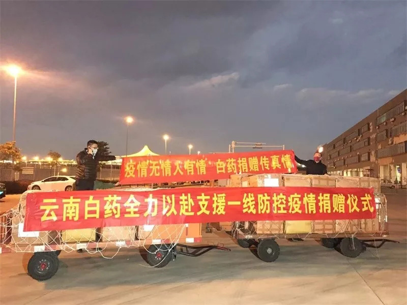 19时30分,在长水机场卸货区,云南省工信厅党组成员、副厅长保建彬、云南白药集团首席运营官尹品耀举行了简短的捐赠交接仪式。