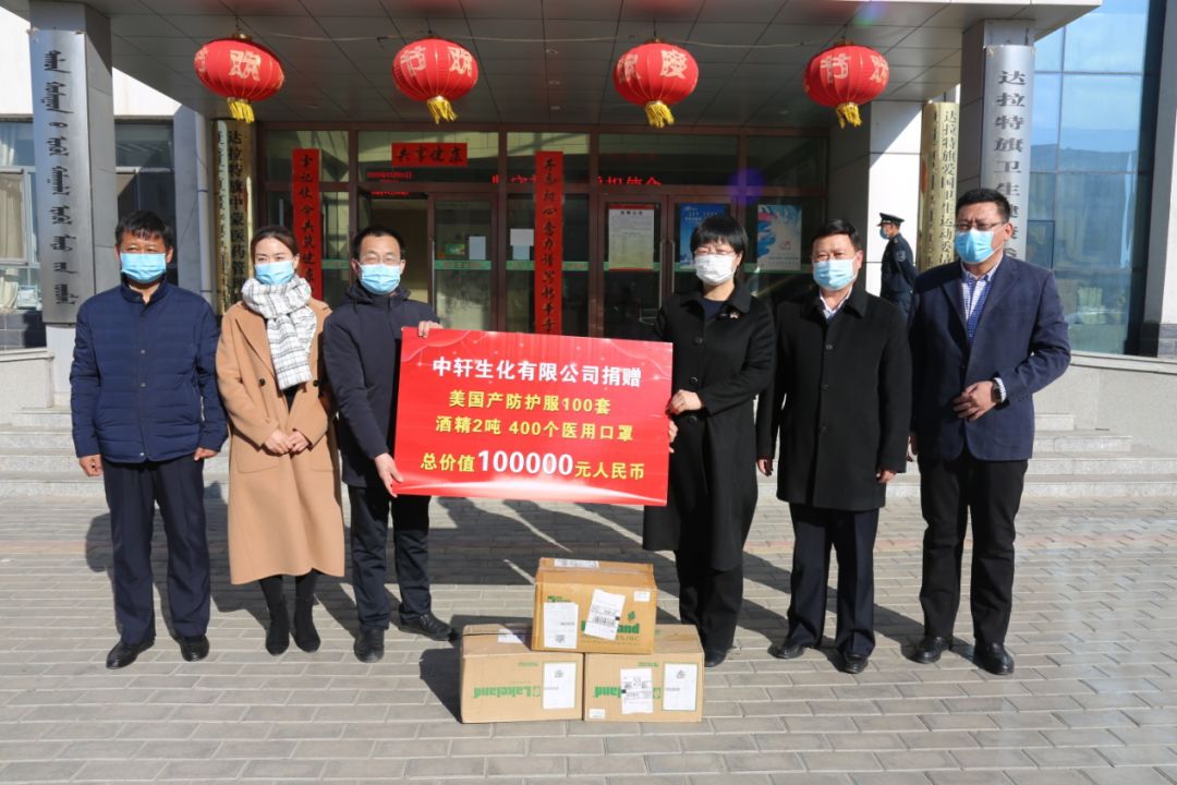 “通过旗工商联的协调,我公司得知目前疫情防控工作形势依然严峻,希望能贡献自己的绵薄之力!”中轩生化有限公司在得知全旗防护物资紧缺的情况后,积极采购物资。此次共捐赠防护服100套、酒精2吨、医用口罩400个,共价值10万元人民币,为奋战在抗疫一线的工作人员提供物资支持。
